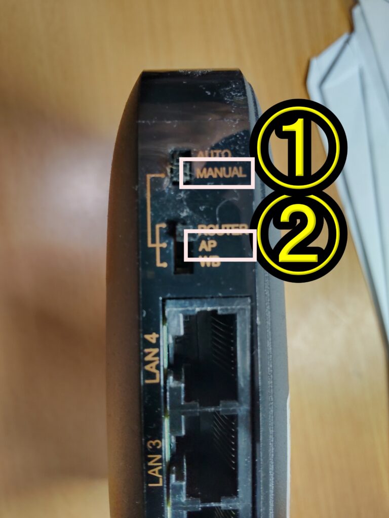 二重ルータを解消するには無線ルータの動作モードをRT(ルータ)からAP(アクセスポイント)モードに変更します。上図はBuffalo の例です。①Autoになっている場合はMANUALに切り替え②ROUTERからAPに切り替えます。