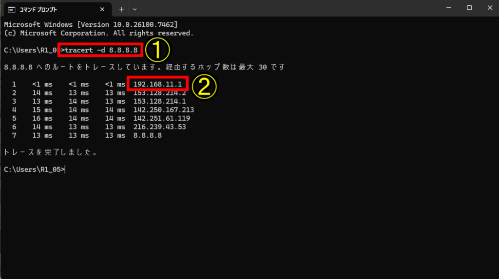① tracert -d 8.8.8.8と入力しエンターキーを押します。