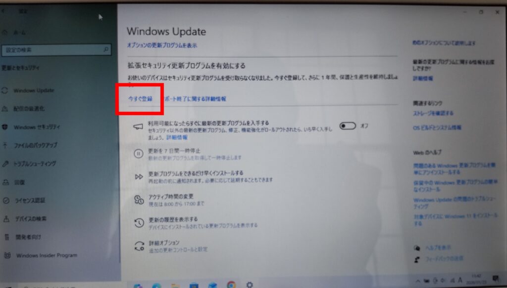 上記の条件を満たすとWindowsUpdate画面に延長セキュリティ更新プログラムを有効にする が表示されます
