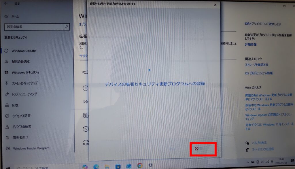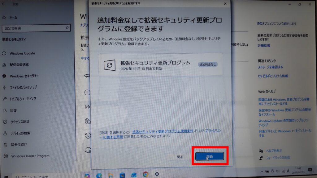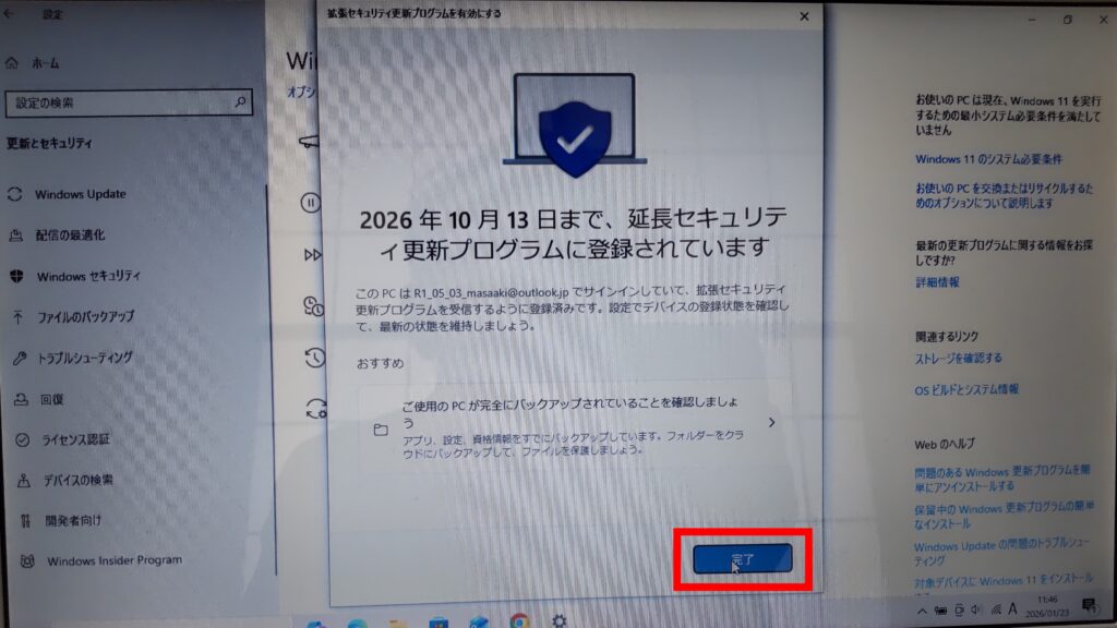 画面右上にお使いのPCは延長セキュリティプログラム更新プログラムを取得するために登録されていますと表示されます
